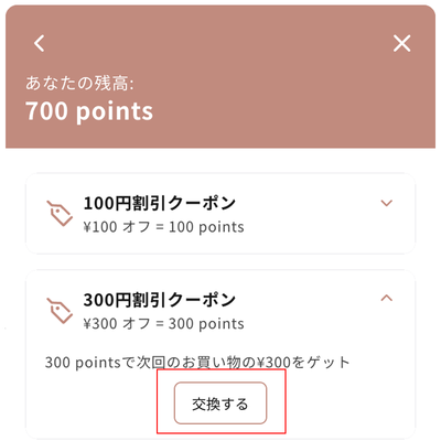 ポイントは割引クーポンに交換し、次回のお買い物の際にご利用いただけます。