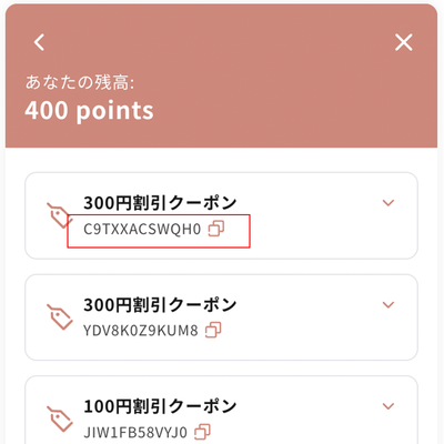 変換したクーポンのクーポンコードをコピーするために「コピー」を選択してください。