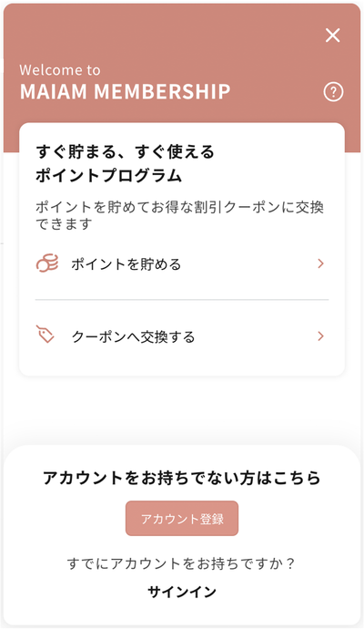 サイト右下の「MAIAM MAMBERSHIP」ボタンをクリック後、ログインいただくと「ご利用可能なポイント残高」「ポイント獲得履歴」の確認、「クーポンへ交換」ができます。