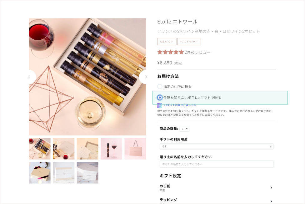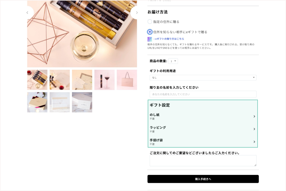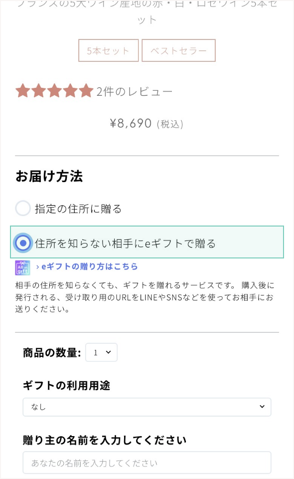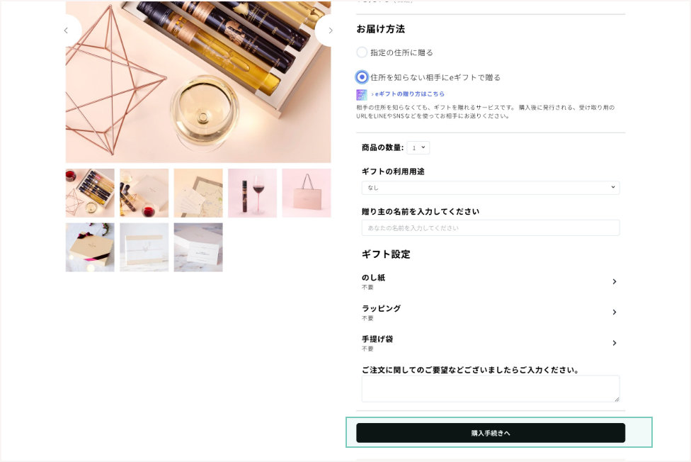 商品ページの中にある「住所を知らない相手にeギフトで贈る」にチェック付けます。
